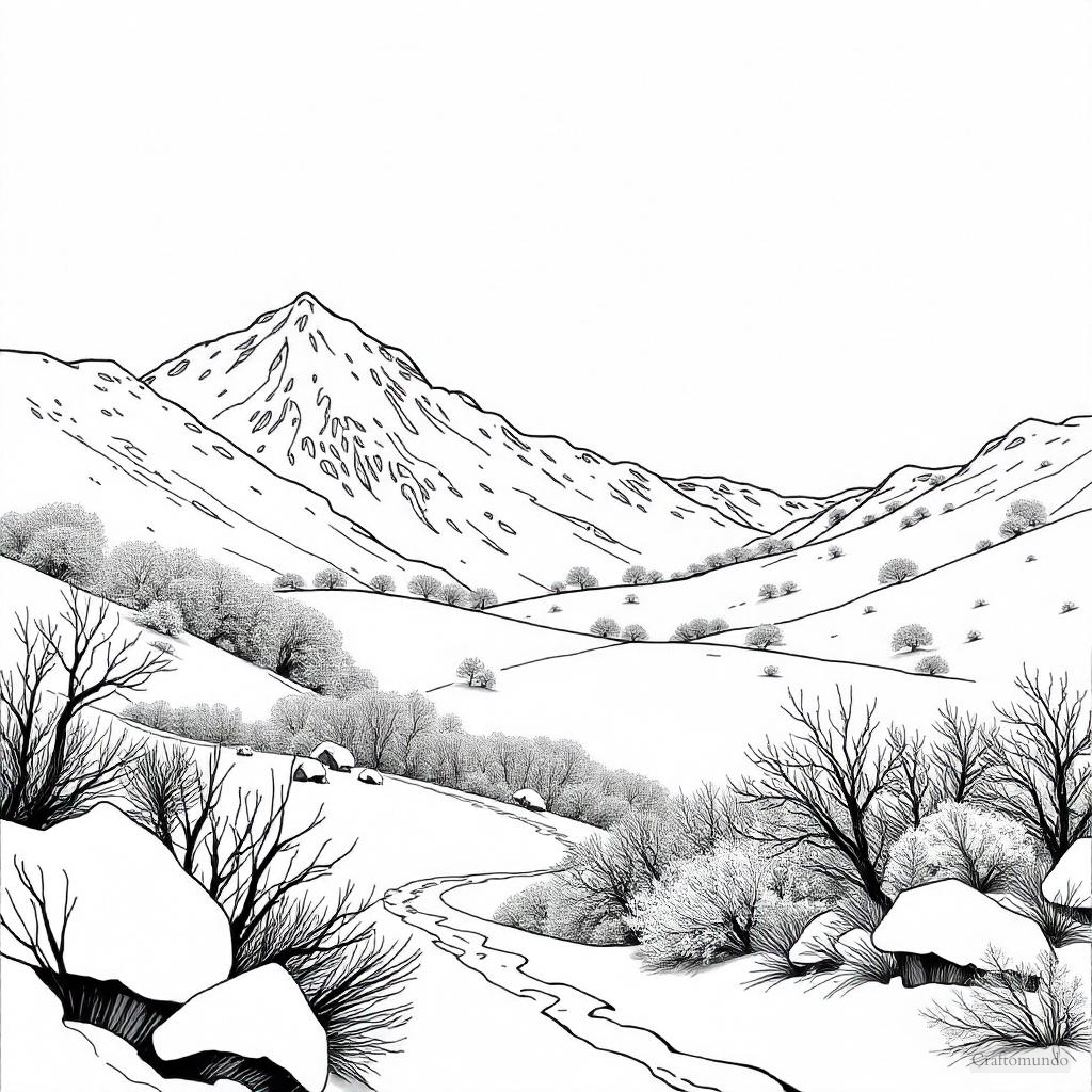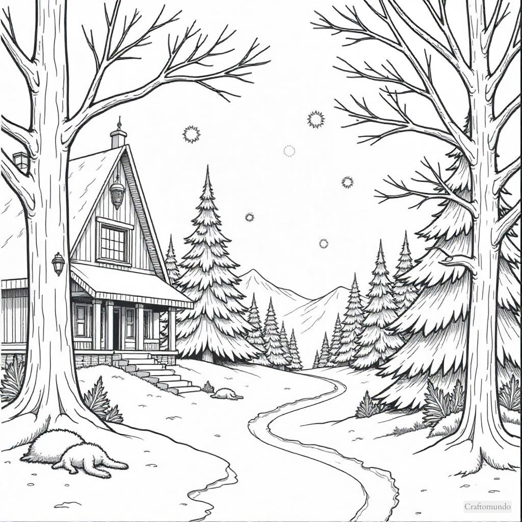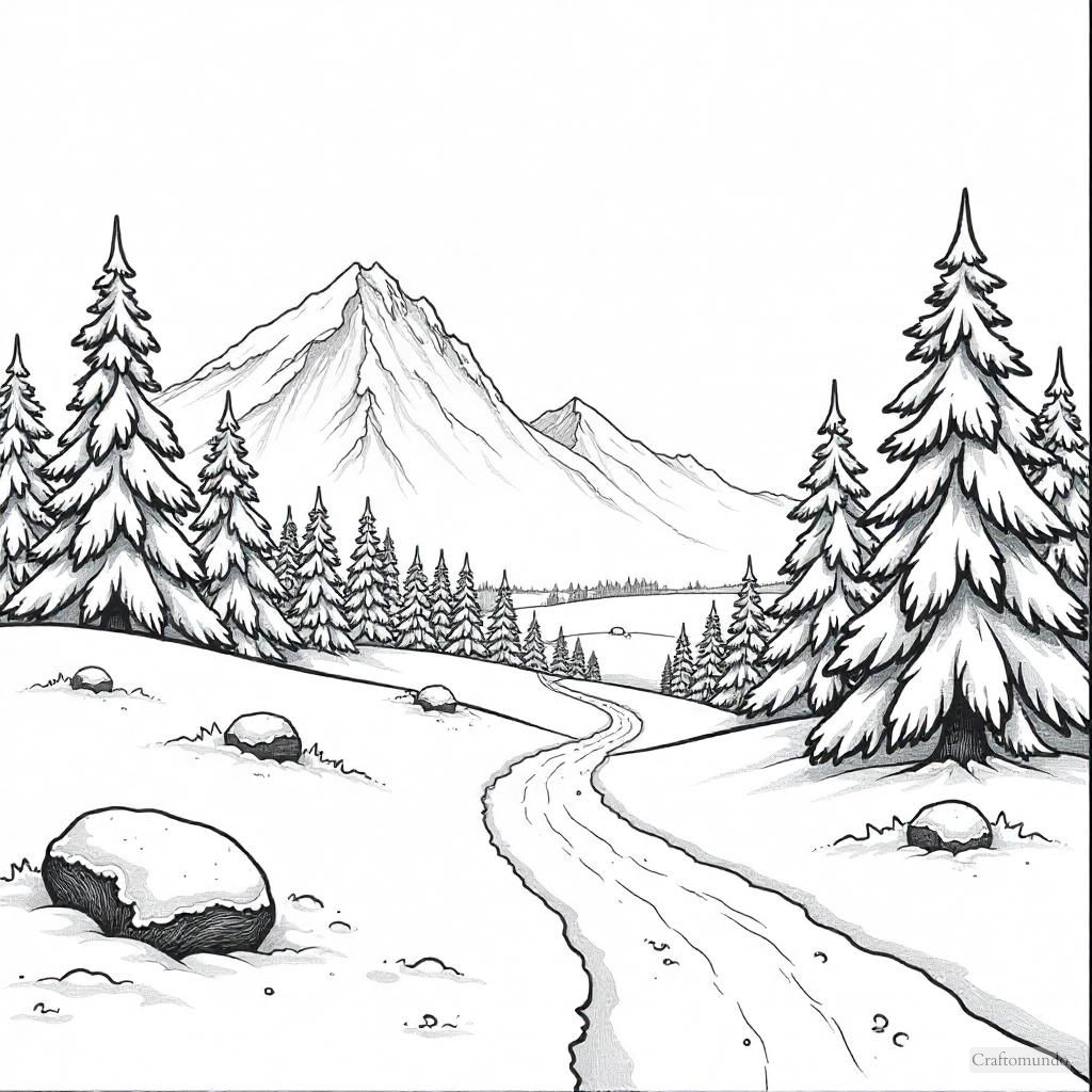 A snowy landscape coloring page offers a calming experience that allows you to play with a palette of cool blues, frosty whites, and soft grays.