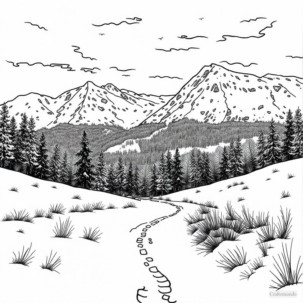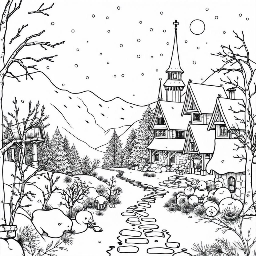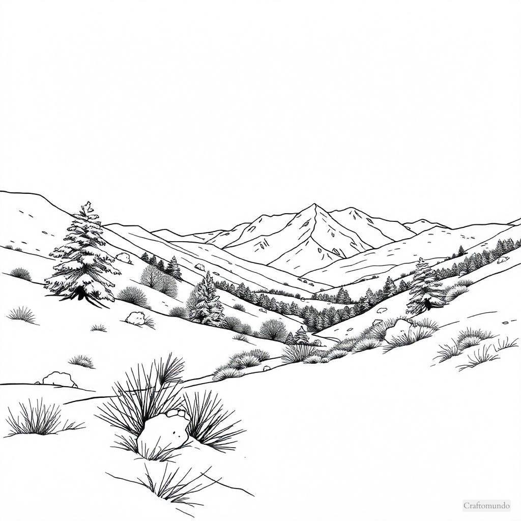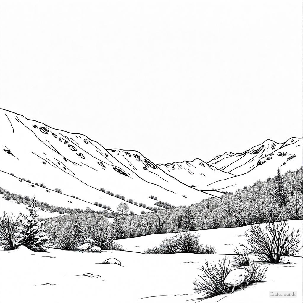 A snowy landscape coloring page offers a calming experience that allows you to play with a palette of cool blues, frosty whites, and soft grays.