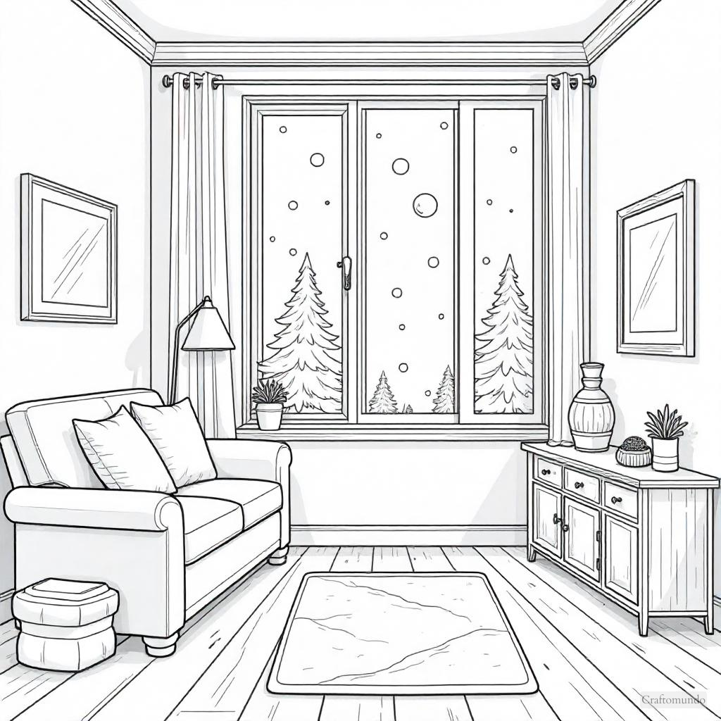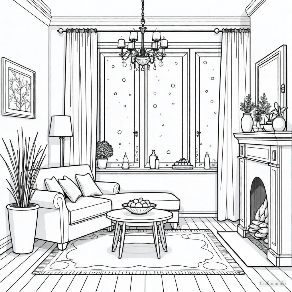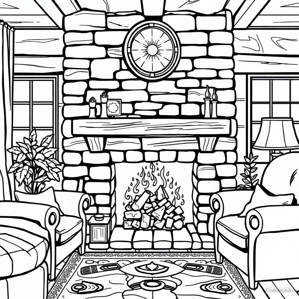 Coloring pages featuring warm interiors with crackling fireplaces, mugs of hot cocoa, and snuggly blankets bring a sense of comfort and warmth.